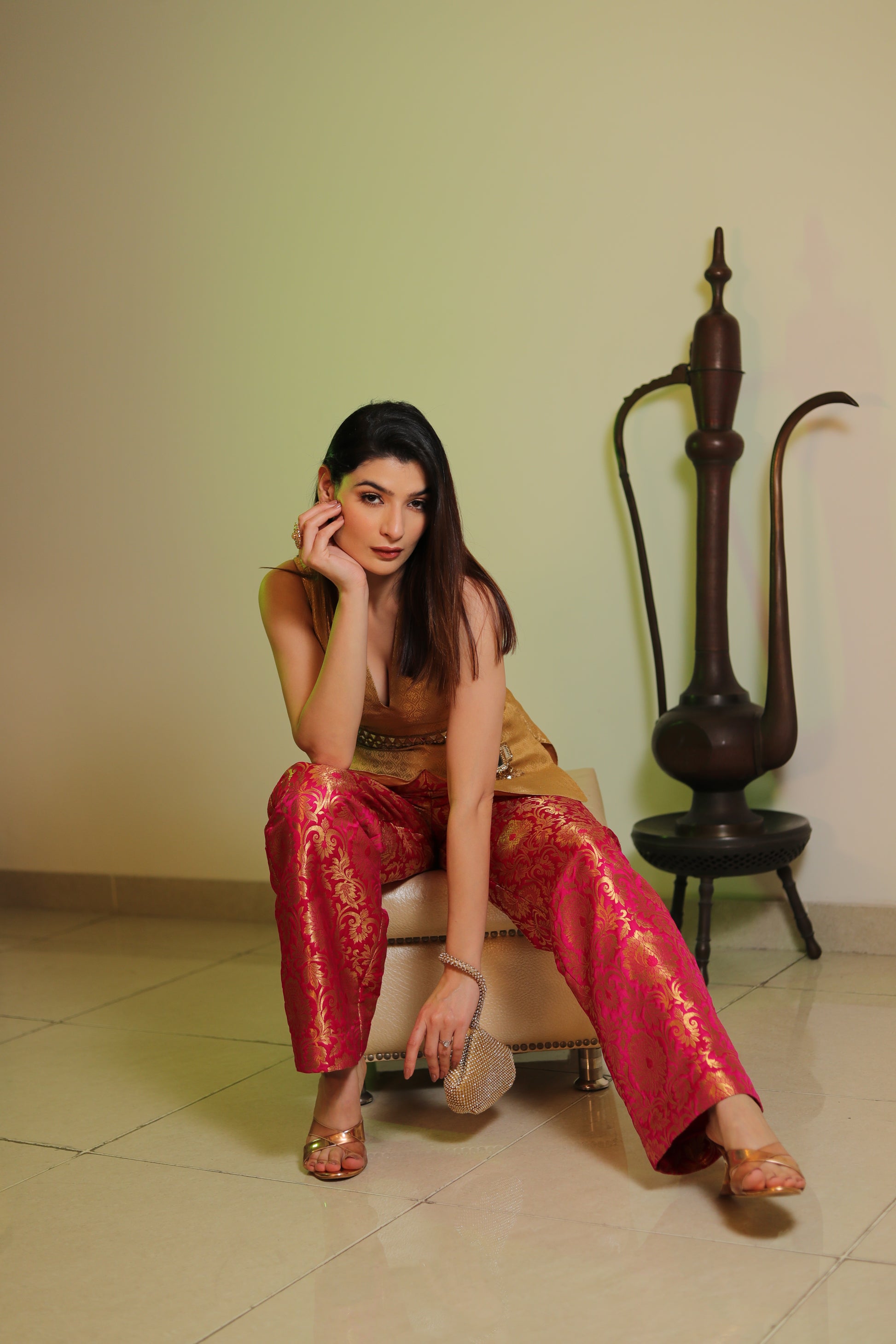 Royal Pure Silk Brocade Gold Top with Pink Pants