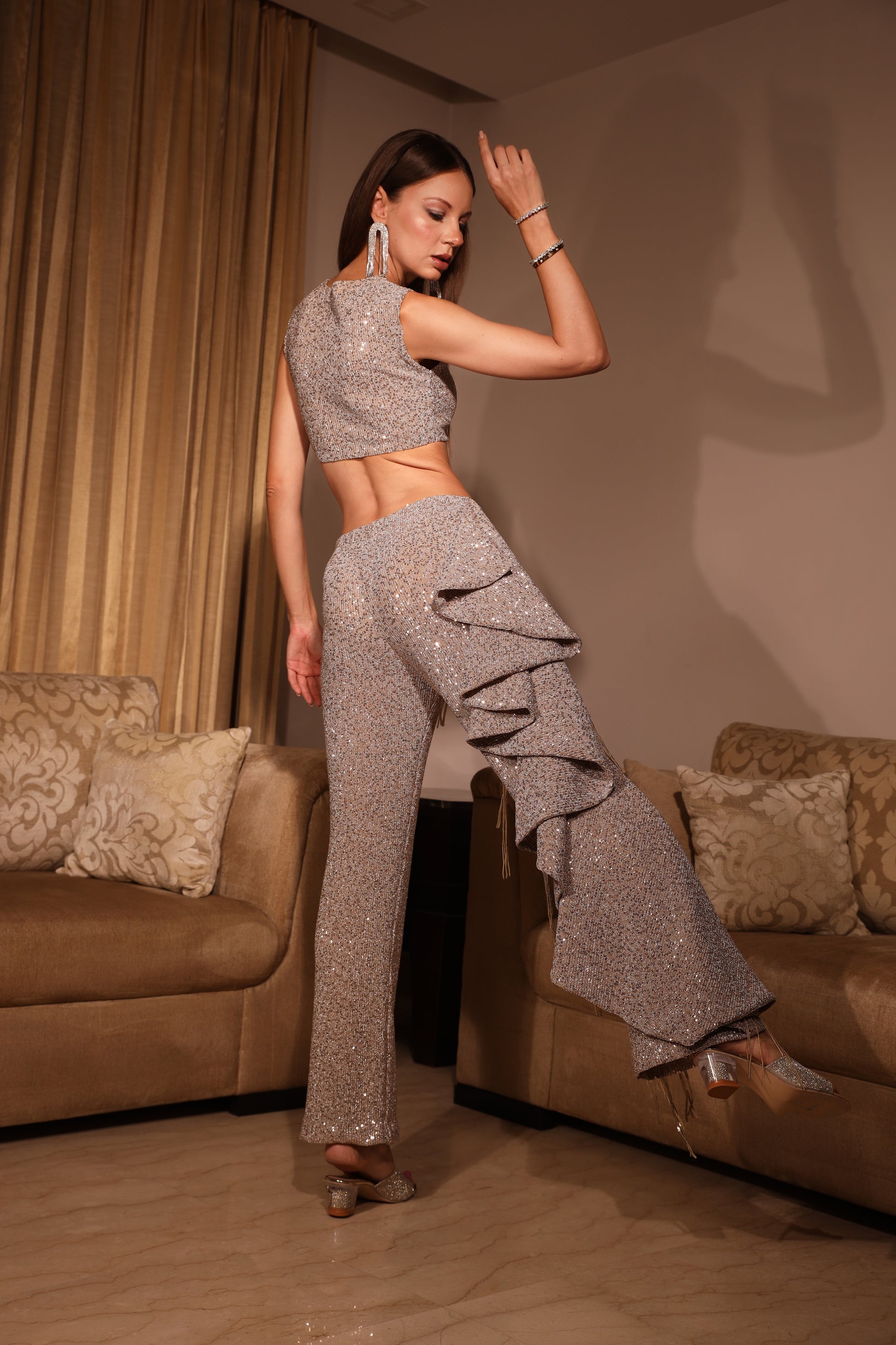 Shimmer sequin crop top paired with single sided ruffle pant embellished with golden sequin tassels